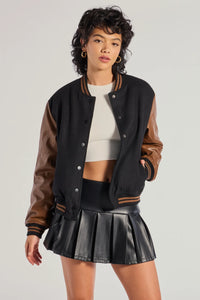 The definition of cool-girl confidence. This faux leather bomber jacket brings an instant edge with its structured silhouette and timeless zip-front design. Throw it over your favorite mini or graphic tee—because every fall look needs a little attitude.