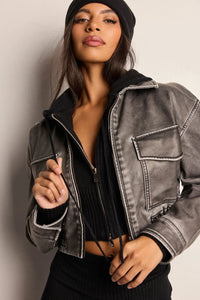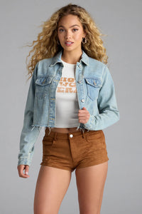 So laid back and chill, this denim jacket will become an essential in your lineup. This versatile jacket has trendy frayed edges and a flattering cropped silhouette that pairs perfectly with high-waisted bottoms!