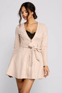 Show that professional side like the boss babe that you are in this adorable trench dress! It features long fitted sleeves, a V neckline, a complete zip down front, a tie front belt to cinch your waist, and a flirty flared hemline. Layer this dress over faux leather pants and style with strappy heels for a chic vibe.