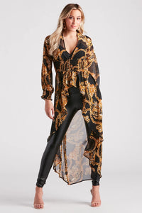 Show off your bold babe status with this eye-catching and chic chiffon duster. It features a V-neckline, a smocked high waist with a partial button-down front, long sleeves with cinched smocked hems, and a flowy high-low silhouette with a ruffled front design. The airy chiffon fabric features a chain-link and scroll multi-print pattern. Layer over a bodysuit with faux leather pants and heels.