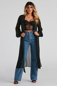 Showcase chic perfection in this airy chiffon trench. Featuring long blouson sleeves, a tie-front belt, and a flowy mid-length silhouette, this trench is the perfect lightweight layer. Style with strappy mules.