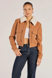 Cozy up in this faux wool trucker jacket! It's a must-have, cute jacket of the season with a faux sherpa collar and flattering cropped length.