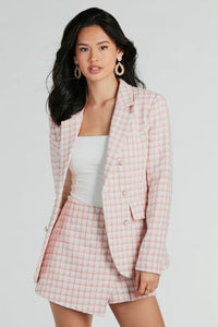 Envoke posh confidence in this preppy tweed plaid blazer perfect for looking stylish around the office or out with the girls! Crafted with a chic plaid tweed woven fabric, this blazer is designed with classic details like a lapel collar neckline and shoulder pads for a structured look. The faux pearl double-breasted button closures add a touch of beauty, while the front flap pockets keep your hands warm. Complete the look with the matching skort.