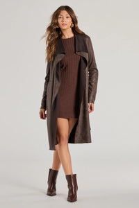 Make a chic impression in this faux suede belted trench coat. With a lapel collar and long sleeves, it's your go-to for effortless style. Tie it up and strut with confidence!