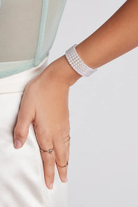 Elegant Glam Rhinestone And Pearl Cuff Bracelet Elegant Glam Rhinestone And Pearl Cuff BraceletDress up your look with this gorgeous cuff bracelet that will give off elegant glamour! It features a memory wire design with mini rhinestones and faux pearl embellishments. Pair with sparkly stud earrings. Fit & Features - Six-row memory wire design