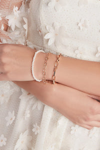 Chic Elegant Pearl And Chain Bracelet Set Chic Elegant Pearl And Chain Bracelet SetAdd an elegant touch to your look with this dainty bracelet set! The multipack features three bracelets with a classic chain-link design, a heart-shaped chain-link design, and a faux pearl beaded design. Style this chic set with an adorable skater dress. Fit & Features - Three-pack bracelet set