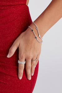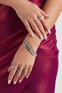 Glam Details Rhinestone Chain Bracelet Glam Details Rhinestone Chain BraceletThe glam details of this rhinestone chain bracelet will really elevate your everyday looks! The bracelet features nine rows with one snake chain, two rhinestone-adorned chains, and six dainty chains. Style with stud earrings for a simple and chic vibe. Fit & Features - Nine rows