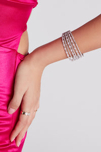 Level Up The Glamour Rhinestone Cuff Level Up The Glamour Rhinestone CuffLevel up the glam factor of your formal look with this glitzy rhinestone cuff! The bracelet features a flexible three-row open-ended design with mini rhinestones and baguette-shaped rhinestones. Style with an embellished clutch. Fit & Features - Flexible three-row open-ended design