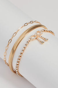 A three-pack bracelet set features one rhinestone bracelet, one snake chain bracelet, and one chain link bracelet. Style with a jumpsuit for any event.
