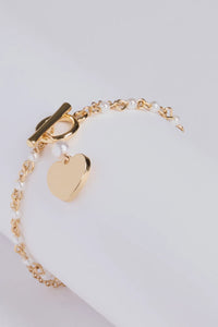 A luxe heart charm pearl chain bracelet secured with a toggle closure. Pair with a corset top and jeans.