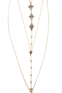 This trendy boho inspired gold body chain will totally get you ready for festival season! It features two layeres around the neck attached to a belt chain. Includes filigree triangle shaped detailed beads and lobster clasp closures.