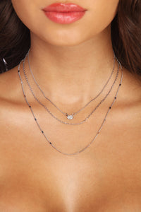 This dainty layered chain link necklace will be the perfect accessory to add to all your looks! It features three rows of silver chains, the shortest layer showcasing a small oval shaped rhinestone adorned charm.