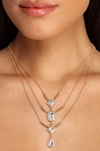 Make your look gleam and glam with this dazzling gemstone layered necklace! It features three rows of dainty gold chain links attached with four multi-faceted gemstones, three outlined with rhinestones, as the centerpiece that cascade down. Includes an adjustable lobster clasp closure.