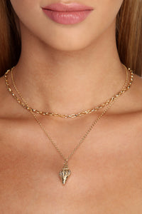 Add a touch of sea to your outfit with this cute gold necklace! It features 2 rows of link chains and a conch shell charm. Closes with a lobster clasp closure.