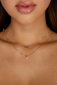 Create a sparkling moment that will last a lifetime! This gold necklace features a dainty chain with a two row design, a fuchsia hued baguette stone and a drop cubic zirconia stone. Includes a lobster clasp closure.