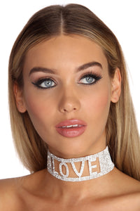 You've got lots of love to give! This silver statement choker features rows of small rhinestones with a large "love" script in the center. Includes a lobster clasp closure.