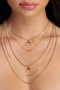 Get those glam chic vibes with these half moon layered necklaces! They feature five layers of mixed gold chains, two of the rows showcasing pretty half moon charms.