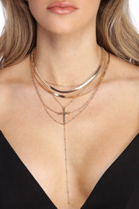 Keep on trend with these must have necklaces! This set includes two gold necklaces, one that features a multi layered snake chain and other featuring a multi layered dainty chain with a cross charm. Both necklaces include a lobster clasp closure.