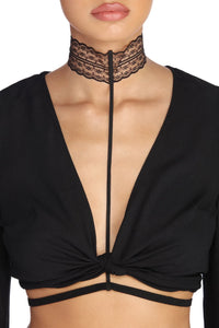 Give your look an extra detail to give it a unique touch! This body harness features a lace choker with a dainty T-strap detail. Includes a lobster clasp closure at the neck and an adjustable bar strap closure.