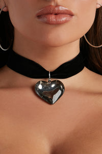 You'll be a top trendsetter with this adorable choker necklace you can dress up or down! It features a wide choker design made of a smooth velvet material with a center large statement heart charm. Includes a back adjustable chain with a lobster clasp closure. Style with hoop earrings.