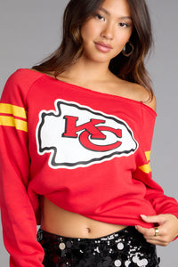 Game-day glam just got a comfy upgrade. This Kansas City Chiefs off-the-shoulder pull-over top brings effortless vibes with a little sporty edge—perfect for bleachers, bar hangs, or both.