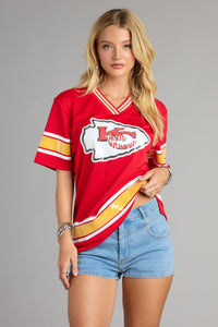 - Sequin-embellished Kansas City Chiefs front graphic and back text graphic