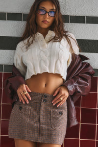 Preppy with a playful twist. This plaid mini skort features front button details and a fitted waist, giving you that polished-yet-flirty vibe—perfect for pairing with the matching trench vest.