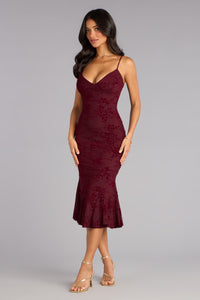 Soft meets sultry in this dreamy mesh midi. Designed with a flocked floral velvet pattern, a mermaid silhouette, and a flared midi hem, it’s your go-to for elegant soirees and dressy date nights!