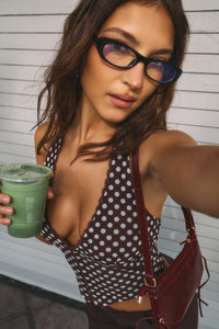 Vintage flirt meets modern cool. This polka dot hook-and-eye top brings all the retro charm with a curve-hugging fit and scalloped edges—made for pairing with low-rise pants, mini skirts, or your favorite weekend latte.