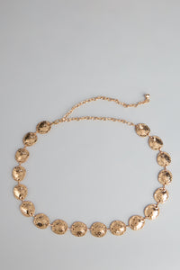 This gold chain belt features textured coin links that instantly elevate any outfit—from denim to dresses.