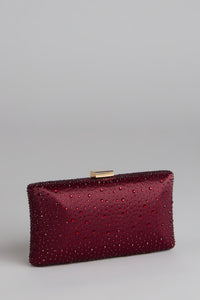 Small bag, major shine. This satin box clutch is scattered with rhinestones that catch every bit of light—perfect for weddings, parties, or any formal plans that call for extra sparkle.