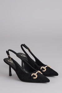 Classic, but make it glam. These pointed-toe slingback pumps elevate any look with sleek lines, a rhinestone horsebit trim, and an adjustable ankle strap that keeps every step secure—and stunning.