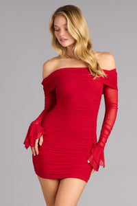 All eyes on the neckline. This off-shoulder mesh mini hugs every curve with a ruched bodycon fit, sheer long sleeves, and a foldover neckline that adds just the right touch of soft drama.
