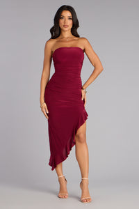 The kind of dress that speaks fluent confidence. This strapless midi dress hugs your curves with soft ruching and a flirty ruffle slit—effortlessly romantic, just bold enough to turn every entrance into a moment.