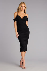 All allure, zero effort. This mesh midi hugs your shape with romantic ruching, soft draped sleeves, and pearl accents that catch the light just right—because subtle glam still makes a statement at any party and on date nights!