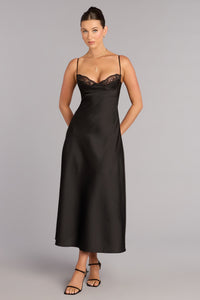 Whispered Elegance Lace Trim Satin Midi Dress