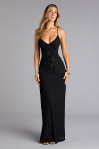 A gown made to captivate, the Adriane floor-length dress boasts delicate straps, a plunging neckline, and sculpted beaded floral embroidery that draws the eye. Finished with a lace-up open back, it’s the perfect balance of allure and elegance.