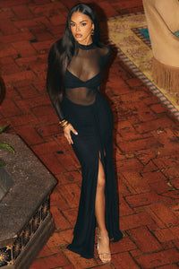 Effortlessly alluring, the Marabelle mesh gown captivates with a corset-style bodice, daring thigh-high slit, and lace-up back detail. The sleek mermaid silhouette was made for entrances that linger long after you’ve arrived.