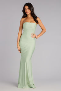Sleek, sculpted, and effortlessly captivating—the Sierra gown brings understated glamour to every occasion. Crafted from smooth knit fabric, this mermaid gown features a clean square neckline, delicate straps, and a tie-back detail that adds a hint of allure to its timeless silhouette.