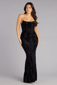 A little romantic, a little rebellious—this mesh midi is made to flirt. The floral velvet flocking and open back bring the drama, while the curve-hugging fit keeps things effortlessly chic for any event.