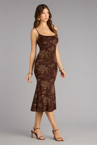 All eyes on you—the strapless silhouette and velvet flocked florals do all the talking. With a bodycon fit and leg-baring slit, this midi dress is pure confidence in motion.
