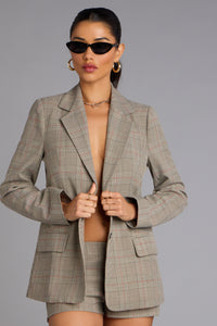 Your “I planned this” blazer—clean, tailored, and instantly elevated. The plaid woven finish gives it that strategic, cool-girl polish that works from brunch to late-night plans without ever trying too hard.