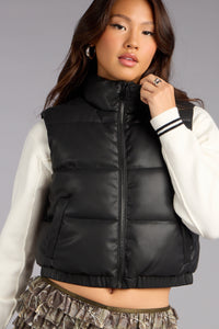 Unlock a cozy fall style. This faux leather puffer vest is lined with soft faux sherpa for that perfect mix of edgy and cozy—ideal for layering over knits, hoodies, or flannels when the temps drop.
