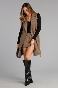 Plaid, but polished. This faux wool trench vest comes belted at the waist for a cinched fit, making it the perfect pairing with the matching skort.