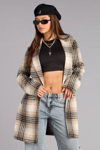 Layer this plaid trench coat for an effortless style day or night. With a classic collar and soft faux wool, this coat will be your new favorite staple all season!
