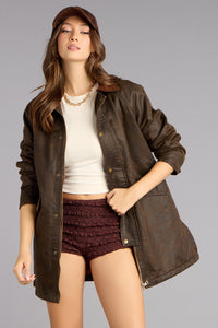 Cool-girl comfort meets vintage soul. This oversized jacket gives that perfectly worn-in feel with coated fabric, quilted lining, and a cozy corduroy collar. Toss it over flowy dresses or denim jeans for an effortless vibe this season.