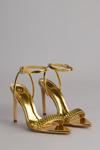 When the invite says “dress to impress,” these heels deliver. Featuring sleek metallic straps with rhinestone accents and a sky-high stiletto, they’re made for making an entrance at parties and events.