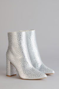 Turn every step into a spotlight moment. These rhinestone booties dazzle with all-over sparkle, a sleek pointed toe, and a block heel made for dancing the night away (or just stealing the scene).