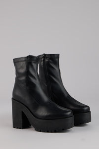 Level up your step—these faux leather ankle booties bring edge with a chunky lug sole and platform design. Perfect for pairing with any bottom and an oversized sweater.