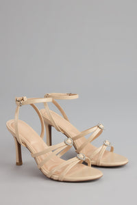 Minimal lines, max glam. These metallic strappy stiletto heels bring sleek shine and an effortlessly modern vibe—perfect for dressing up denim or taking a night-out look higher.